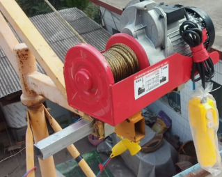 和室外吊運機搭配使用時,微型電動葫蘆的安裝方式是倒裝,因為吊運機的機座支架位于吊運機中間位置,只有安裝在機座上,微型葫蘆的鋼絲繩才能順著吊臂向下延伸,方便吊運重物,在微型葫蘆的罩殼頂部有安裝孔,直接用螺絲就能固定在吊運機機座上。